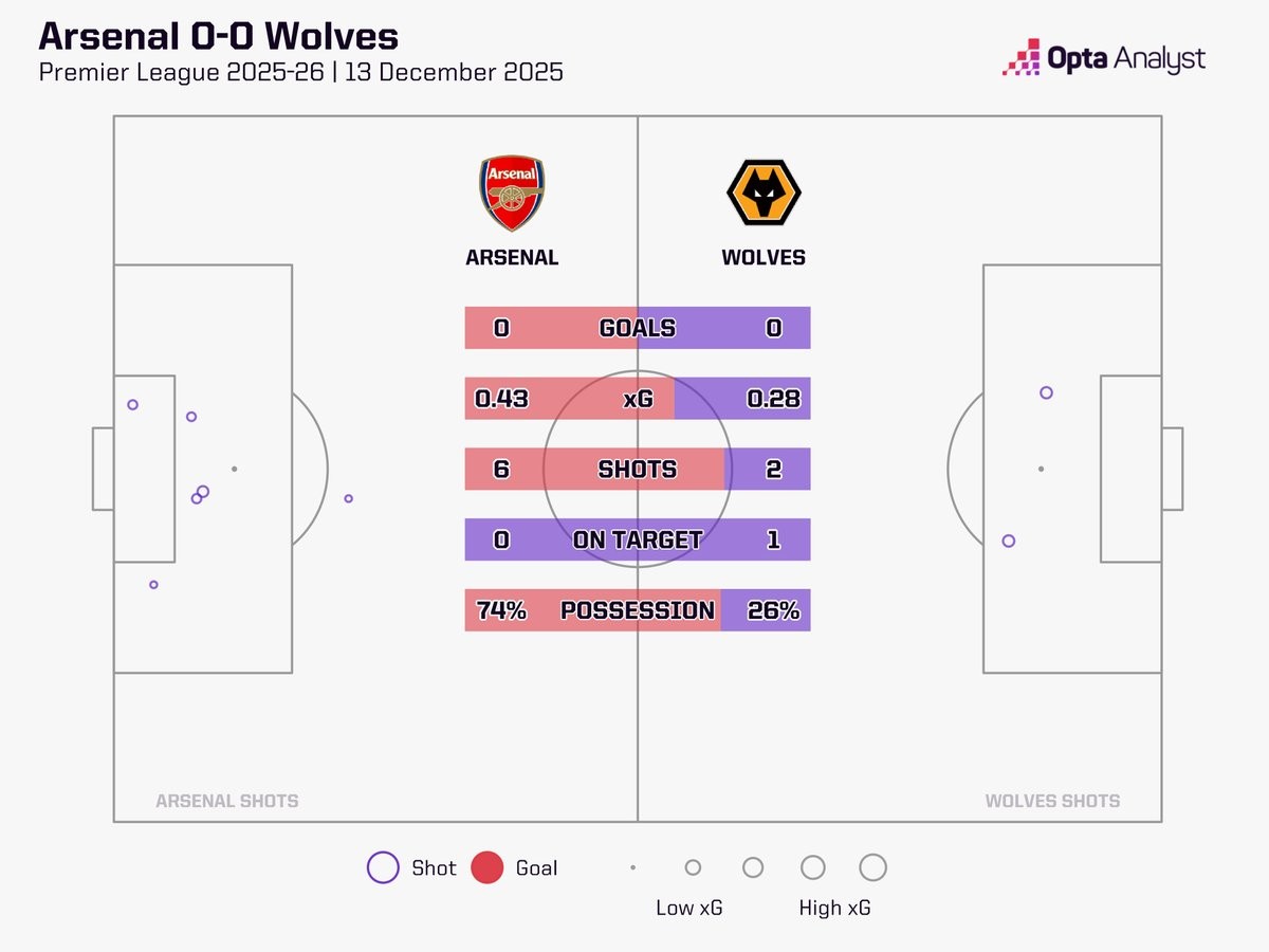 6次射門無一命中目標,阿森納本賽季英超首次遭遇上半場0射正