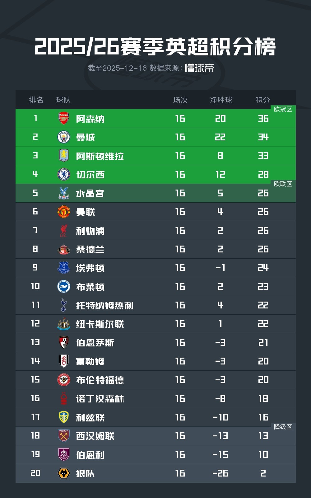 英超積分榜:阿森納仍2分領(lǐng)跑,曼聯(lián)、利物浦等四隊同積26分
